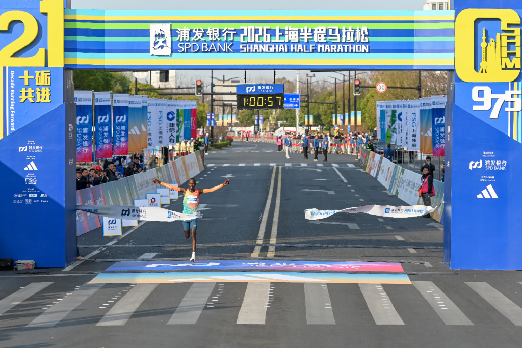 2026年3月15日,上海东方体育中心,来自肯尼亚的男选手所罗门·基尔瓦·叶戈率先冲过终点线,以1:00:57的成绩夺得冠军。澎湃新闻记者 朱伟辉 图
